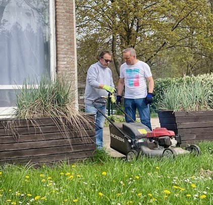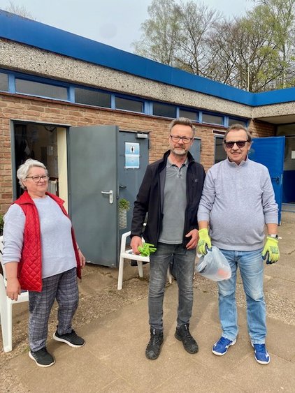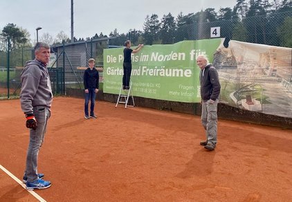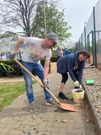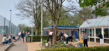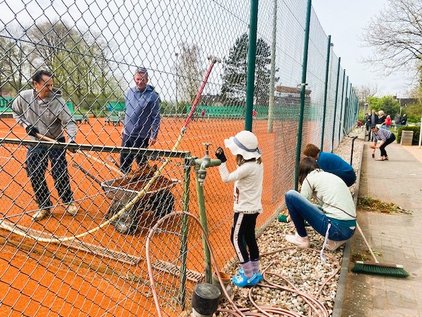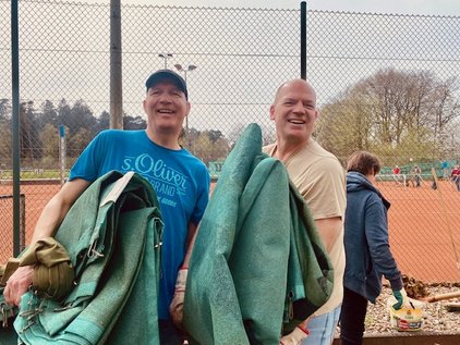 Auch wenn der Zeitpunkt des Abrisses im Laufe der ersten Jahreshälfte ansteht wurden die Außenanlagen wie gewohnt hergerichtet, der Windschutz auf den Plätzen montiert und alle Bänke und Sitzgelegenheiten herausgeholt. Gefühlte 2 Tonnen Unkraut haben die Mädels zwischen den Steinen vor den Plätzen "gepult", der rote Sand wurde aus den Schächten von Platz 1-8 geschaufelt und der Rasen gemäht.
