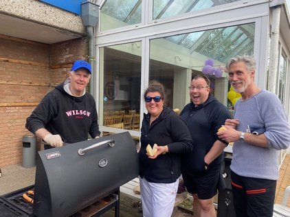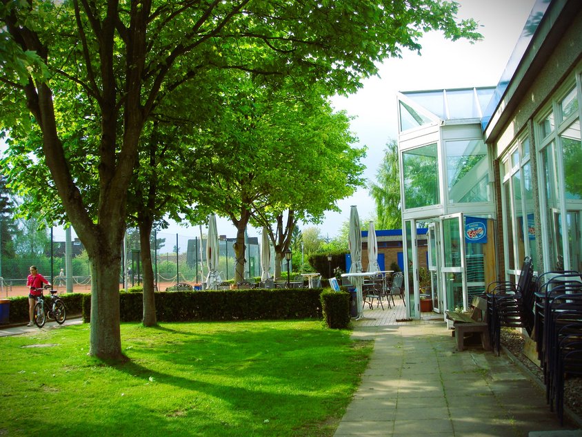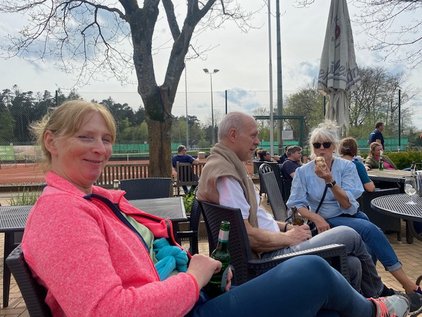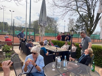 Nach getaner Arbeit sind alle von Thommi mit Würstchen vom Grill belohnt worden und konnten bei herrlichem Sonnenschein wahlweise auf der Terrasse chillen oder sogar schon auf die Plätze, um die ersten Bälle zu schlagen.